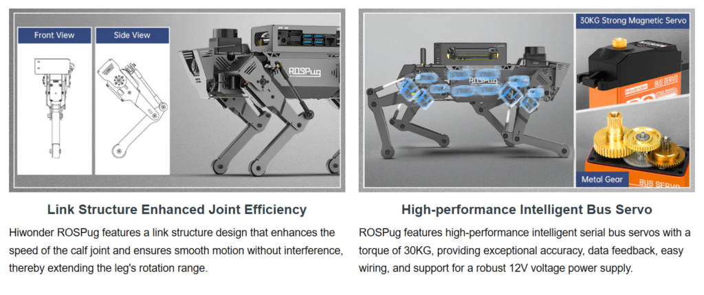 ROSPug is a smart quadruped robot powered by Jetson Nano and built on the Robot Operating System (ROS). It features 12 high-voltage intelligent serial bus servos, providing precise motion, fast rotation, and strong torque, making it highly capable for dynamic tasks.