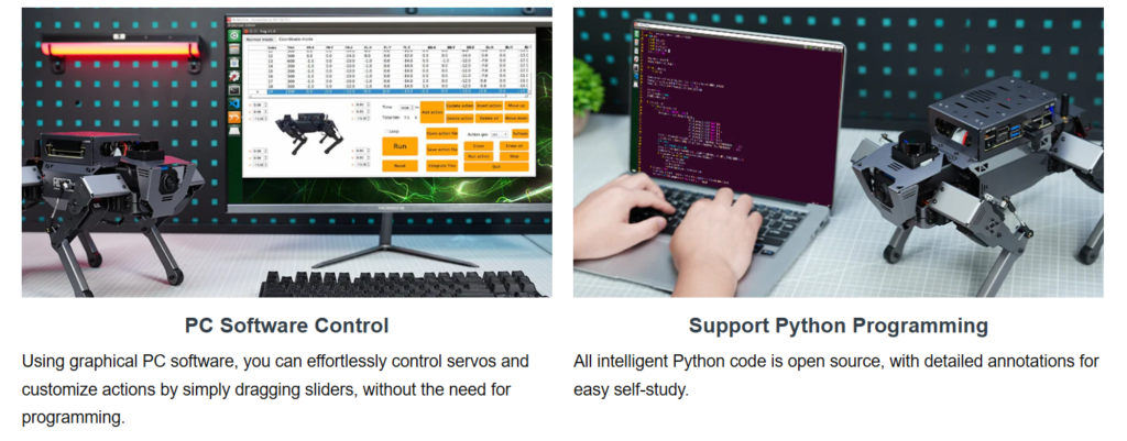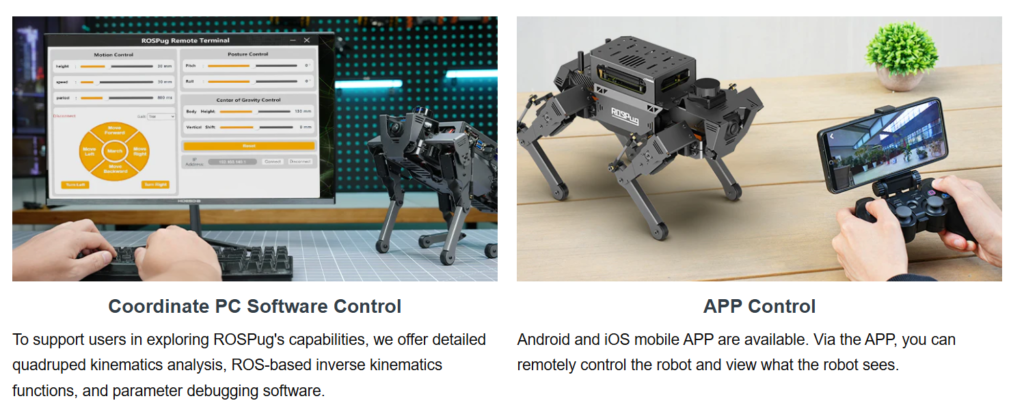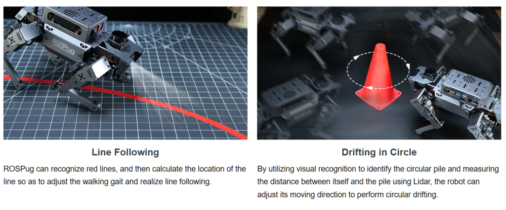 ROSPug supports Gazebo simulation, providing users with a valuable platform to learn and validate quadruped kinematics algorithms and path planning. Thanks to the robust computing power of its controller, ROSPug can perform tasks such as SLAM mapping navigation, path planning, dynamic obstacle avoidance, climbing, obstacle bypassing, and many other applications. We also offer solutions for expansion of ROSPug’s capabilities, including deep learning, machine vision, and other development projects to meet users’ specific needs.