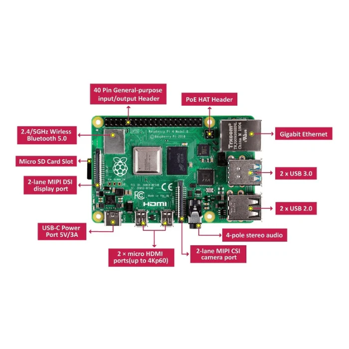 The Raspberry Pi 4 Model B is a major upgrade in the Raspberry Pi lineup, offering improved processor speed, multimedia performance, memory, and connectivity while remaining backward compatible. Powered by a 64-bit quad-core BCM2711 Cortex-A72 CPU and supporting up to 8GB RAM, it features dual 4K micro-HDMI displays, USB 3.0, Gigabit Ethernet, dual-band Wi-Fi, Bluetooth 5.0, and optional PoE support, delivering desktop-class performance for both personal and embedded applications.